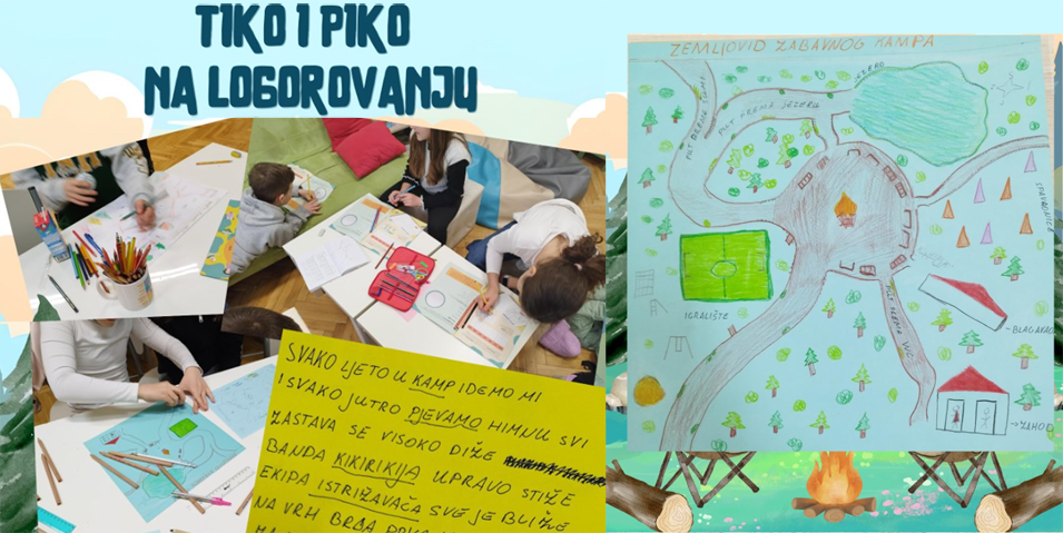 Četvrtaši su u školskoj knjižnici pročitali strip finskih autora Aino Havukainen i Sami Toivonen „Tiko i Piko na logorovanju“. Iako nismo palili pravu logorsku vatru, atmosfera je uz ovaj strip bila ugrijana dok smo ispunjavali trosmjerku, tražili razlike u ilustracijama, pisali dnevnik o svom prvom danu kampiranja, igrali igru asocijacija, sastavljali dnevni meni u kampu… Vrhunac aktivnosti bila je izrada zemljovida zamišljenog kampa, a posebna uživancija bila je osmišljavanje vlastite izviđačke himne! Ne samo što smo je osmislili, upotrijebili zadane riječi i rimu, već smo je i uglazbili i snimili. Ma ludo smo se zabavili baš kao da smo bili na pravom kampiranju!